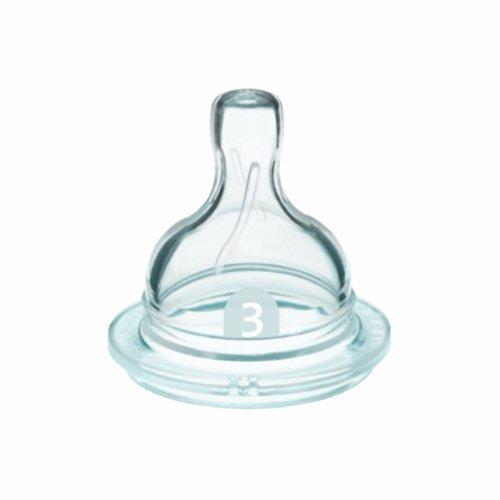 The Philips AVENT medium flow nipple is made of soft silicone and is ideal for bottle-fed babies ages 3 months and up. The naturally shaped nipple makes it easier to transition from breast and bottle feeding and the anti-colic valve promotes active feeding and reduces fussiness and colic with less air in baby's tummy.