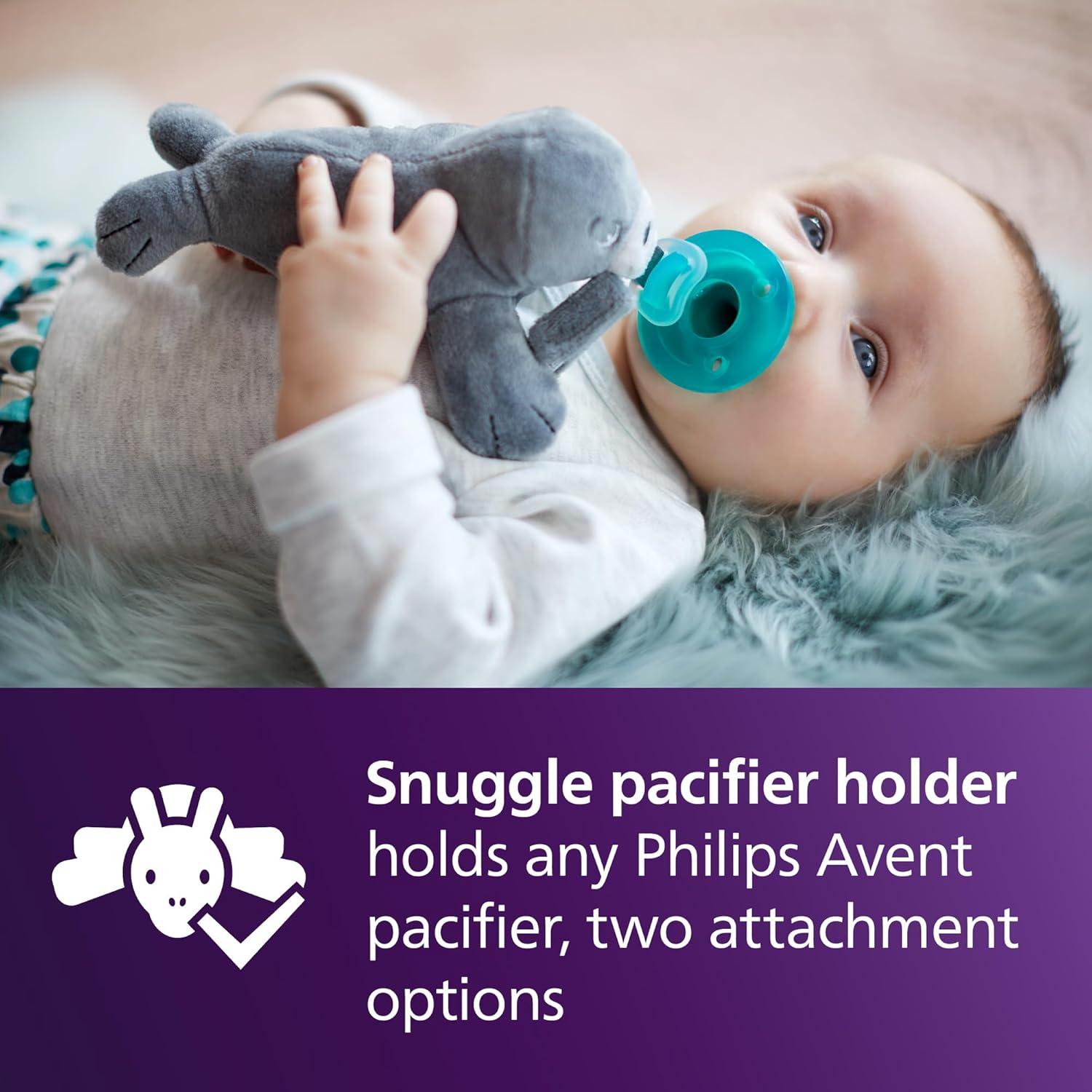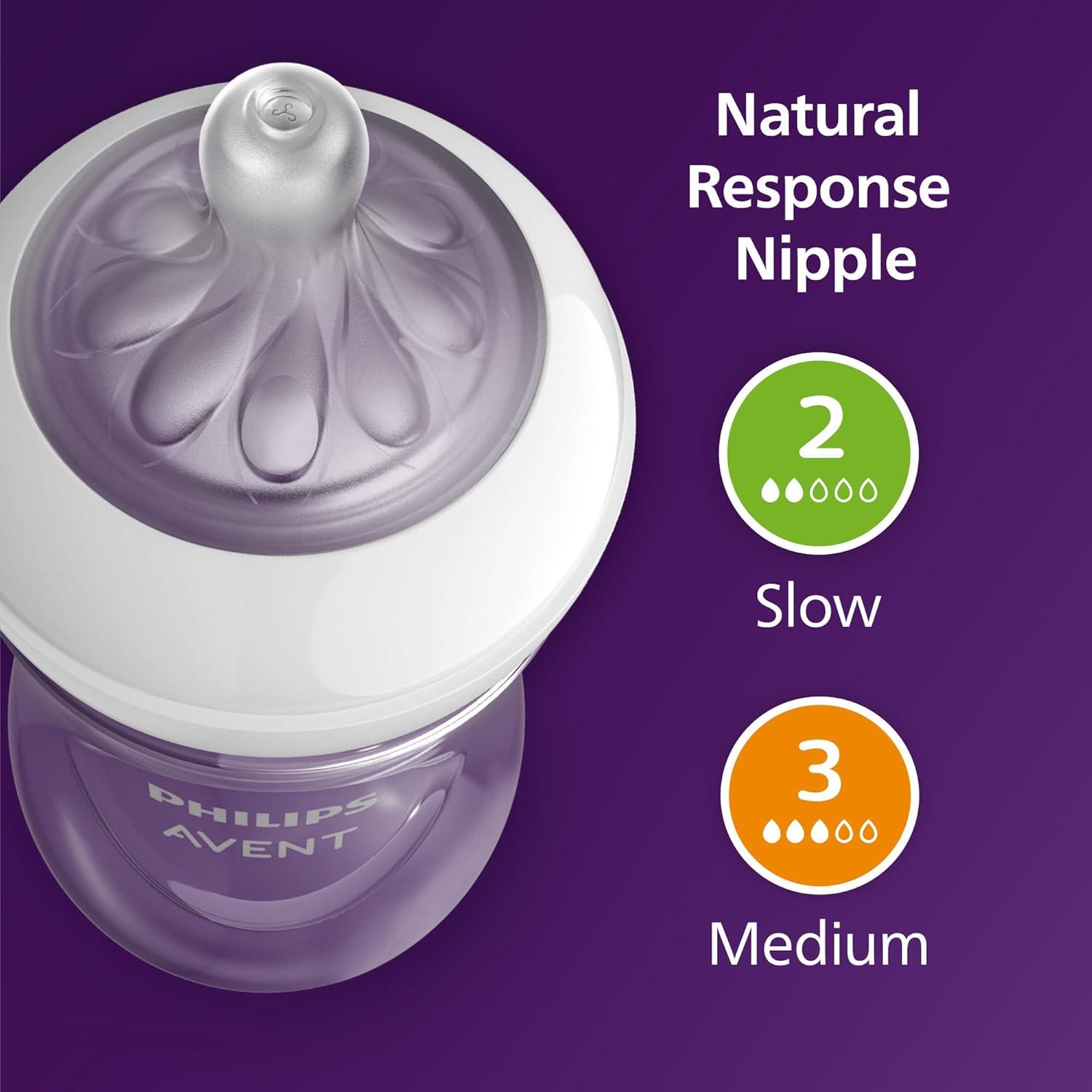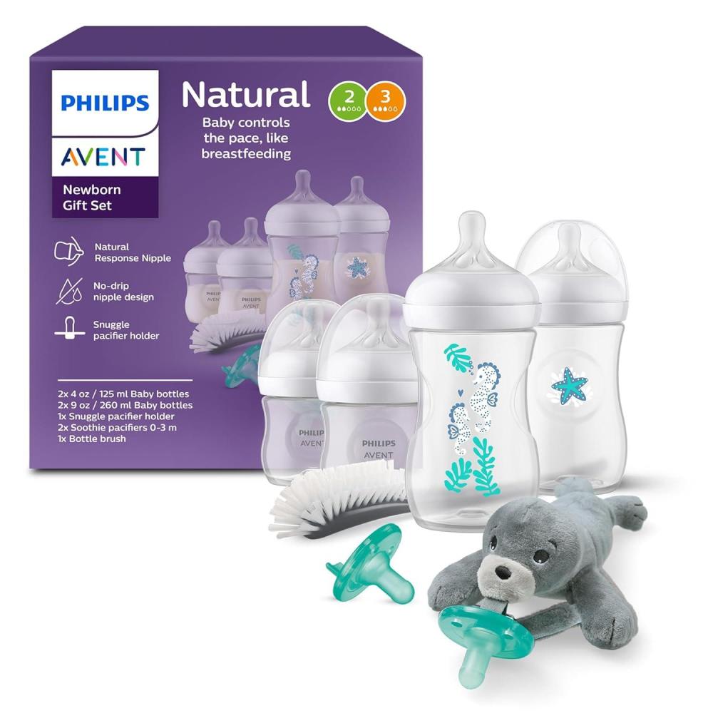 A newborn starter set with color, for new parents. Philips Avent Blue Natural bottles with Natural Response nipple lets baby control the pace of the milk, like they do when breastfeeding. The nipples' unique opening and tip only releases milk when your baby actively drinks. When pausing to swallow and breathe no milk flows. Baby can drink, swallow, and breathe using their natural rhythm, just like they do when breastfeeding. Easily combine breast and bottle feeding with a wide breast-shaped nipple with a soft feel that mimics the shape and feel of a breast; plus baby controlling the flow of milk. A bottle brush with a curved brush head for easy cleaning of rounded bottle edges and a molded tip to clean the nipple. Soothie Pacifiers are used by medical professionals to calm newborns, the highly durable pacifiers features hospital grade silicone and one piece construction. Our soft and lightweight snuggle pacifier holder helps babies feel secure and makes it easy to find the pacifier. Two attachment points to hold any Philips Avent pacifier. The Natural bottle is made from polypropylene, a BPA free material, and works with all nipples and caps from the Natural line. The Natural response nipples come in flow rates 1-5, to keep up with your baby's growth. Includes: 3 4oz Blue Natural bottles with Natural response nipples flow 2, 1 9oz Blue Natural bottle with Natural response nipple flow 3, 1 Snuggle pacifier holder, 2 Soothie pacifiers 0-3 months, 1 bottle brush. SCD838/04 Snuggle contains all new materials. What to expect when introducing the Philips Avent Natural Response Nipple It is totally natural for your baby to take 2-3 tries to get milk flowing from a new bottle. Unlike traditional bottles the Natural bottle is designed to only release milk when your baby is actively drinking, like what happens when babies breastfeed. We have 5 different nipple flow rates for the Natural bottle. When looking for the right nipple flow rate, age is a guide, but your baby's approach to drinking and the feeding cues they will show will help determine when to move to a higher or lower nipple flow rate.