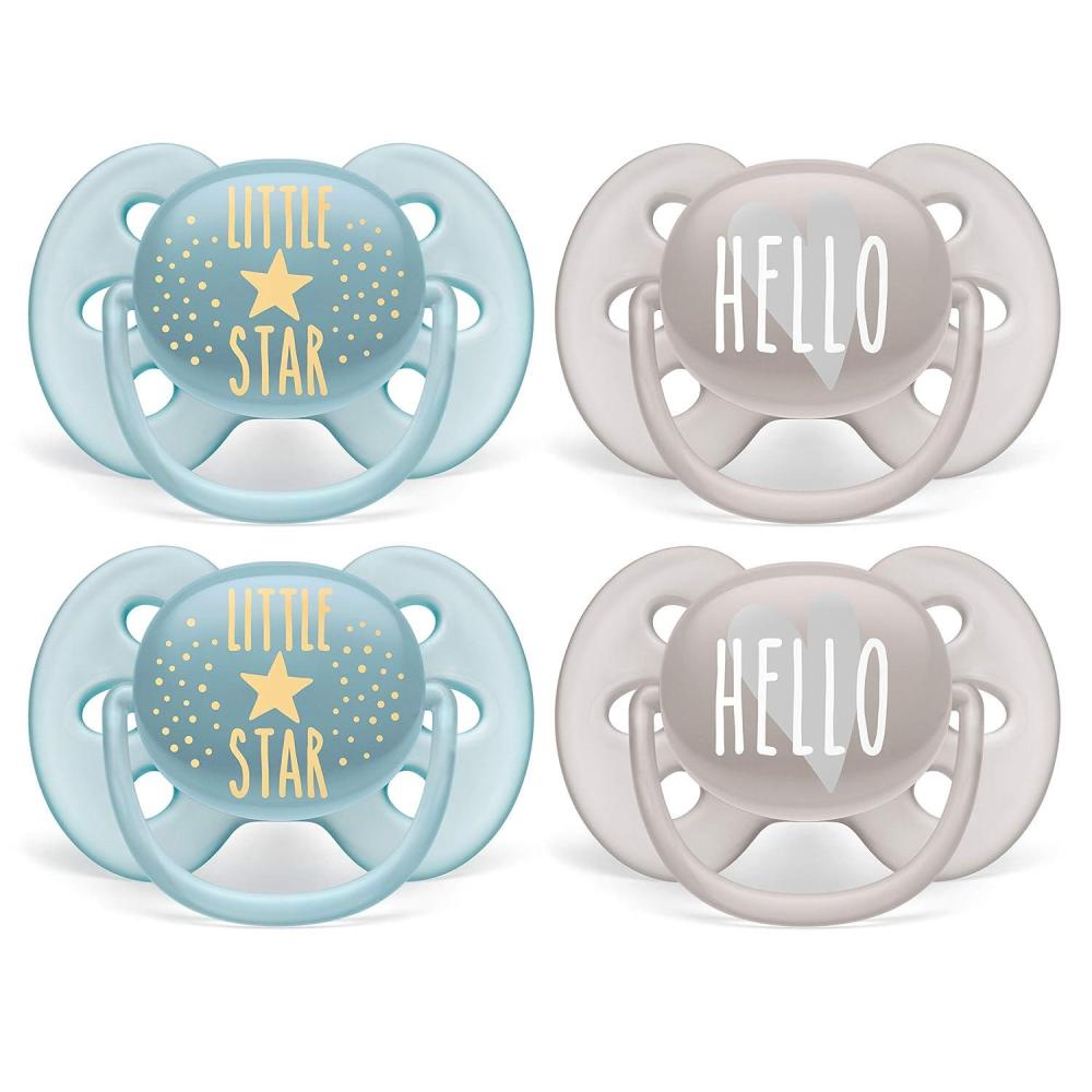 Philips AVENT Ultra Soft Pacifier 0-6 Months, Dreams and Happy Designs, 4 Pack, White/Green, SCF222/43(Little Star/ Hello)