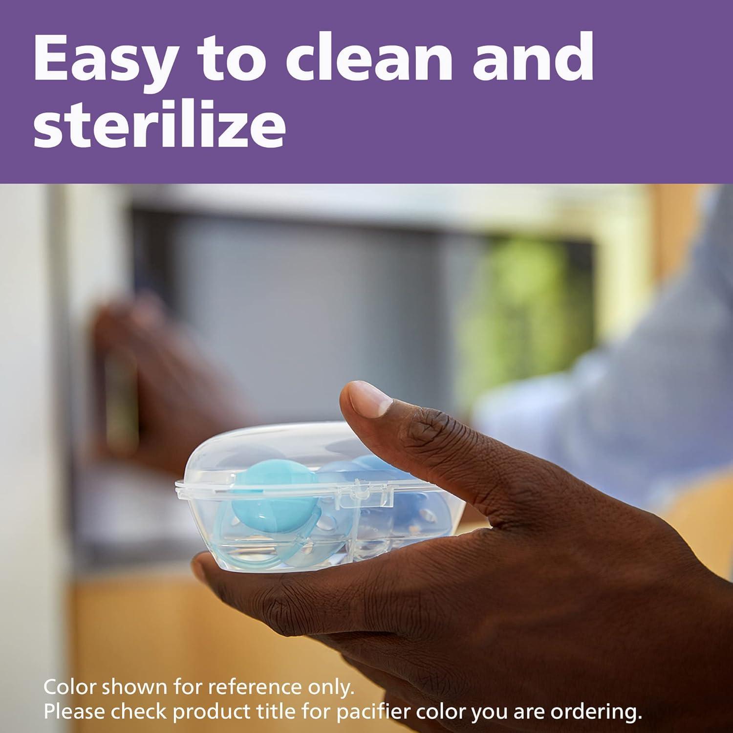 Comes with two sterilizer/ carrying cases; use them to sterilize the pacifiers with water in the microwave and transport them hygienically